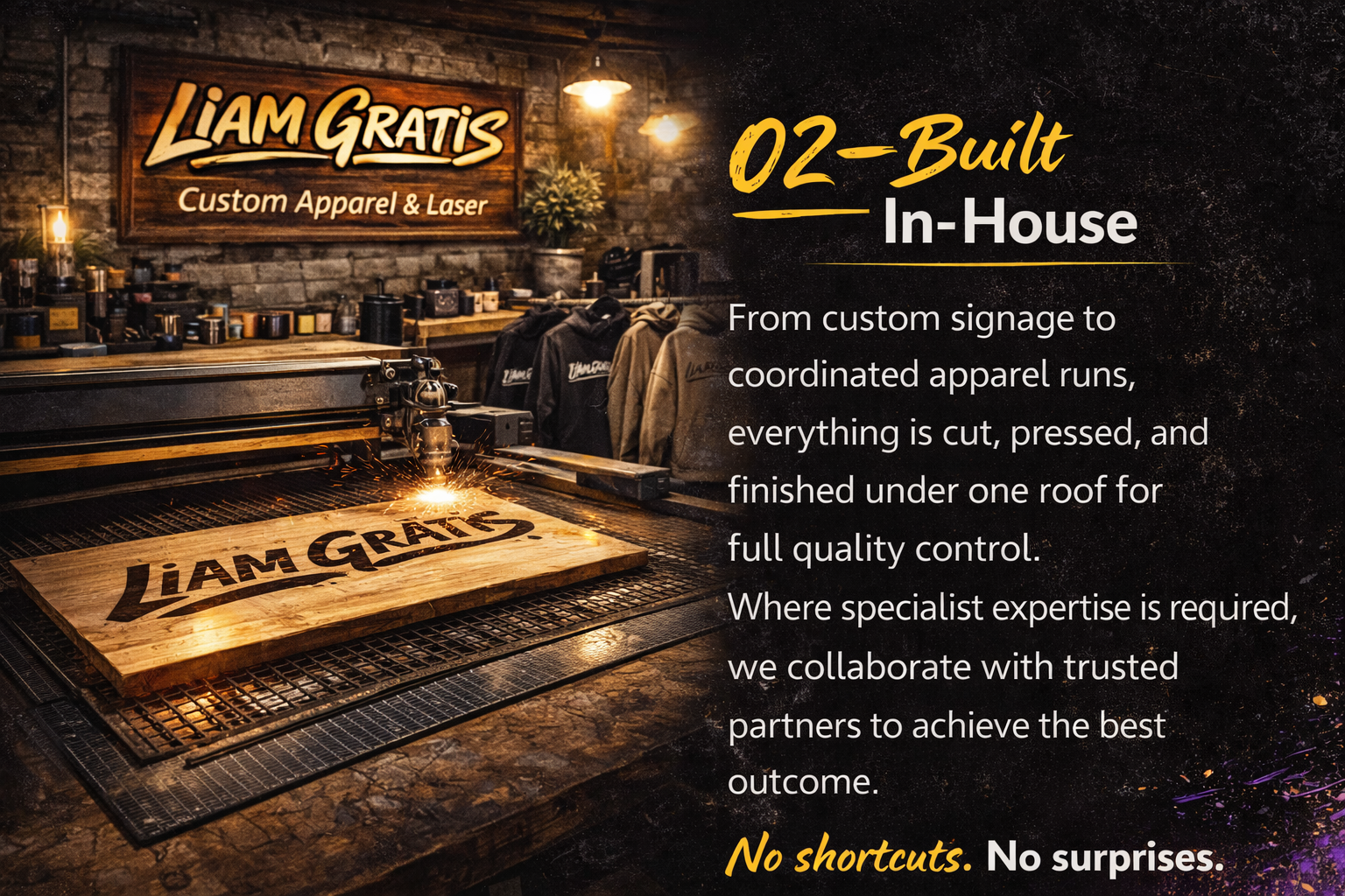 We’re a Custom design and fabrication studio specializing in laser-crafted signage, layered art, and premium apparel.