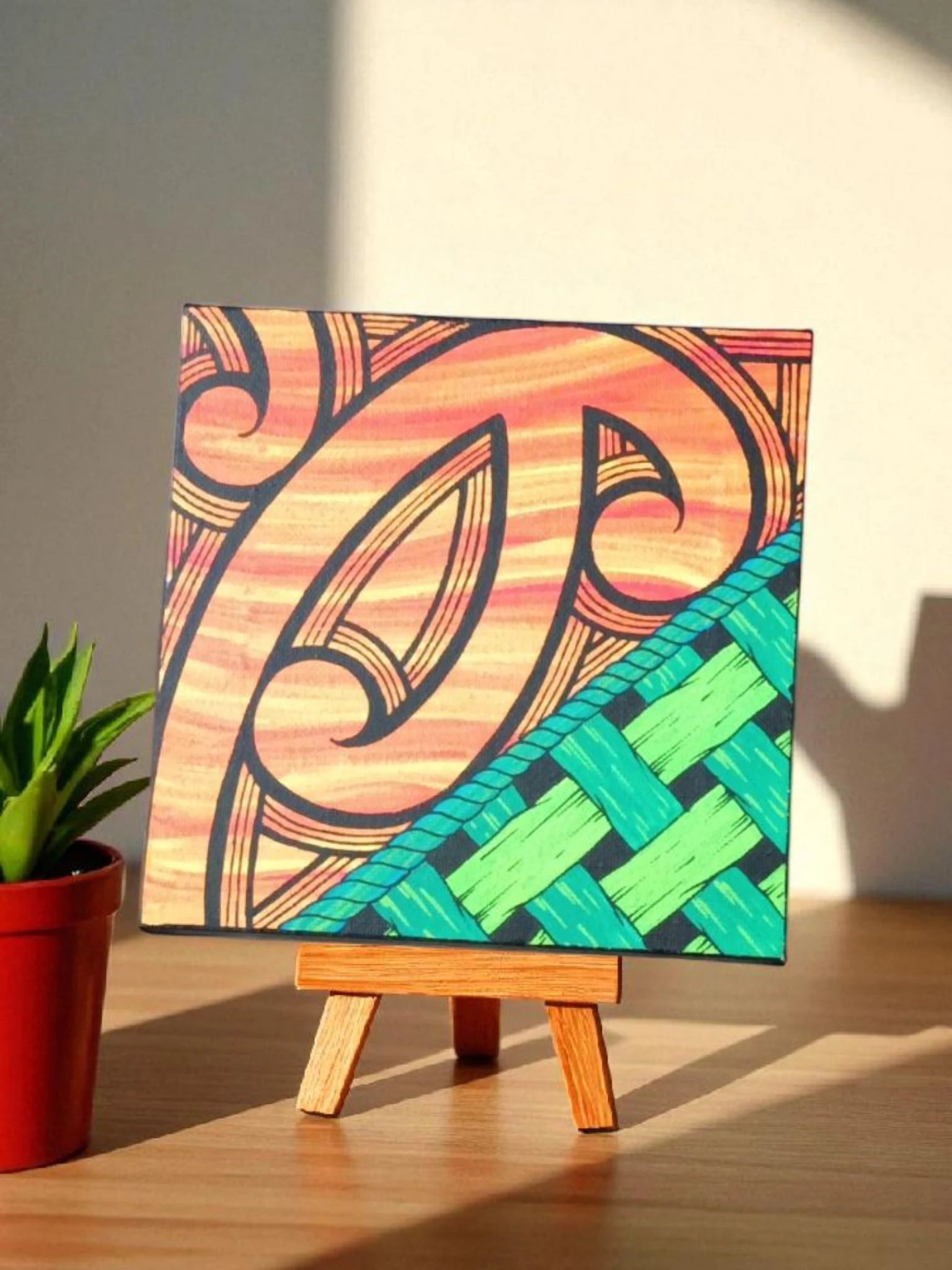 Bring a touch of Taranaki into your space with this hand painted canvas. Featuring signature harakeke patterns and flowing koru designs, each stroke celebrates Local Māori artistry. Vibrant colors and intricate detail make it a standout piece. Perfect as a one-off original to brighten any room.