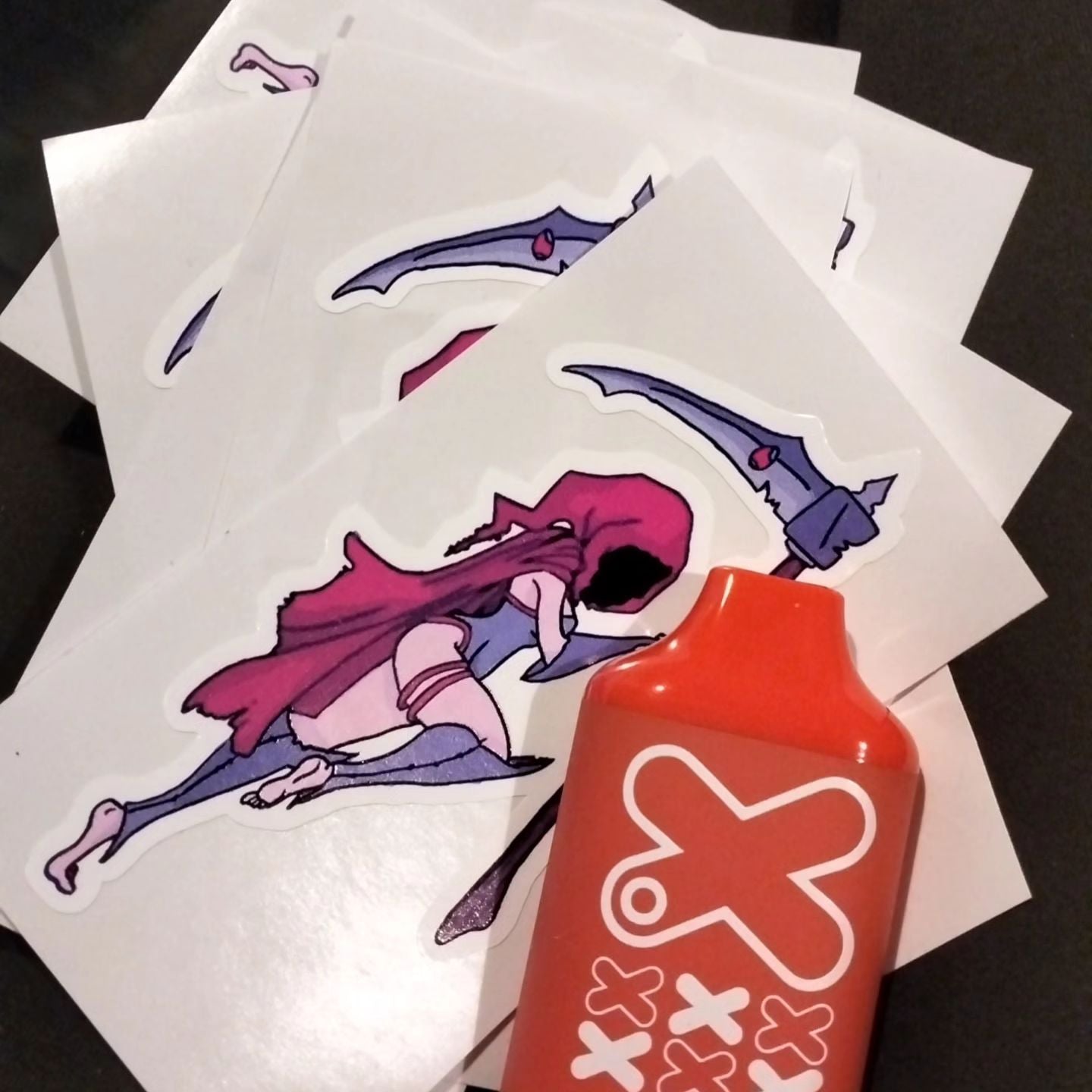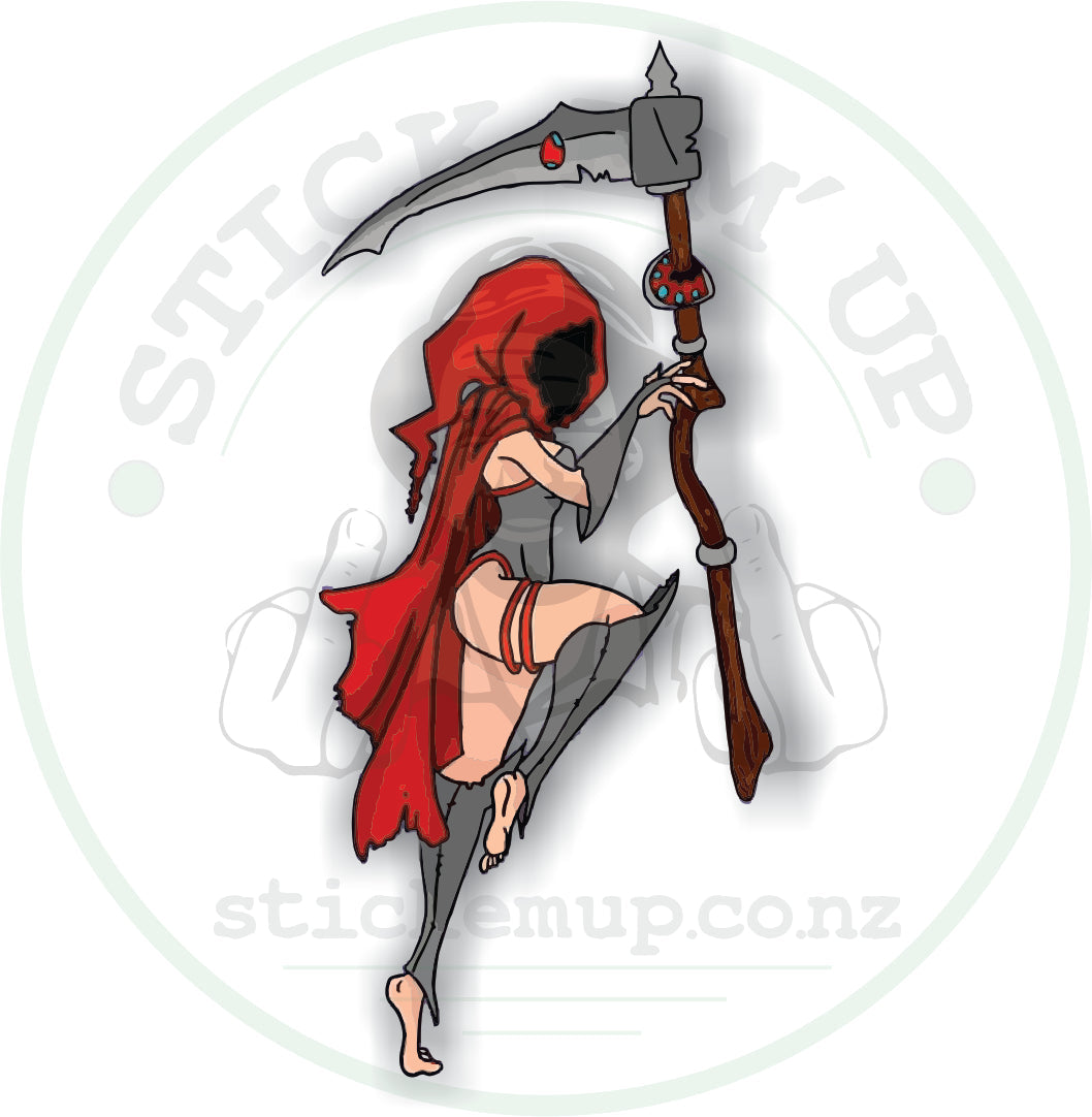Introducing our female Grimm Reaper sticker! This striking design features a powerful and mysterious female figure wielding a scythe. Perfect for those who embrace their dark side, this sticker is a unique and eye-catching addition to any collection. Made with high-quality materials, this sticker is durable, making it perfect for indoor or outdoor use. Bring a touch of darkness and intrigue to your car, laptop, or water bottle with our female Grimm Reaper sticker!