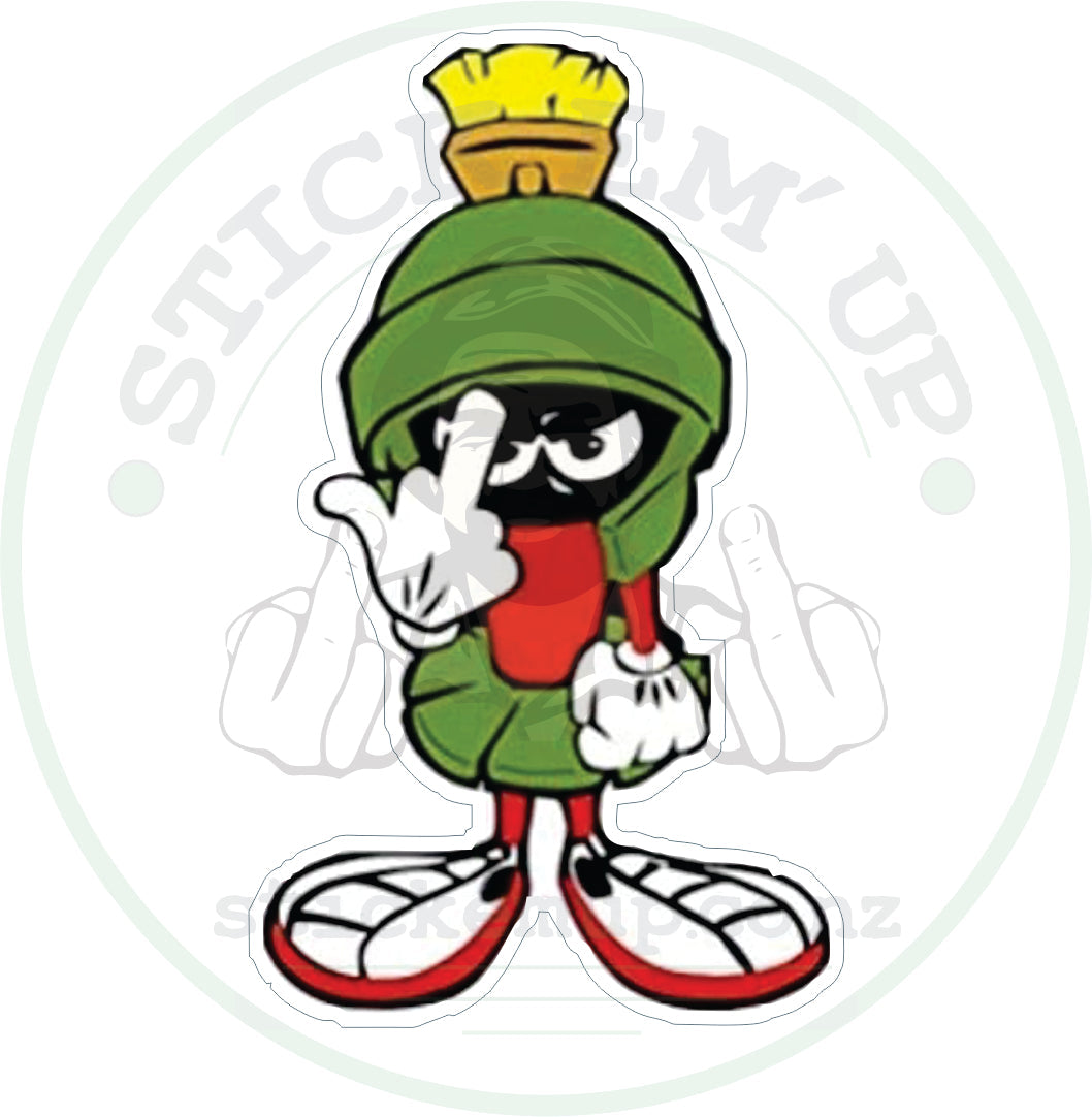 Straight out of Saturday morning mayhem, the Marvin Sticker is a fan art parody of the universeβs grumpiest little space invader. With his iconic helmet, bad attitude, and itchy trigger finger, this design brings retro cartoon chaos with a modern Stick Em Up edge.