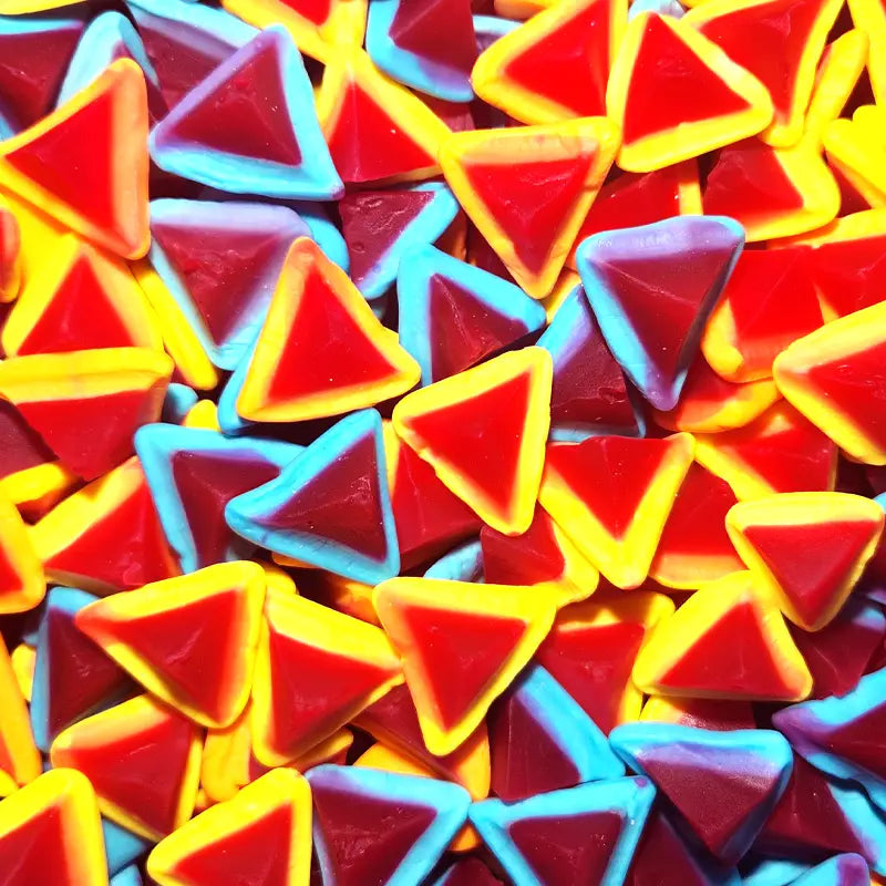 Three erupting flavours of volcano-shaped lollies mixed together in a 1kg Bag. Colourful bottoms with Red Volcanic tops.