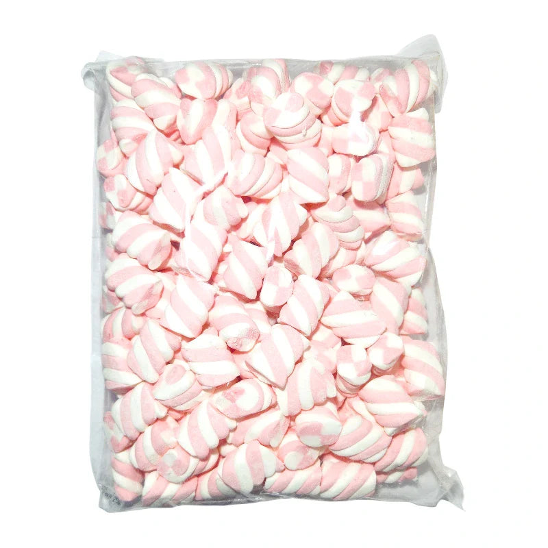 A Soft chewy twisted pink Marshmallow in an 800 gram bag. Light and Fluffy with w Pink and White twist. These are quite light and you get a lot of Marshmallows for the weight.
