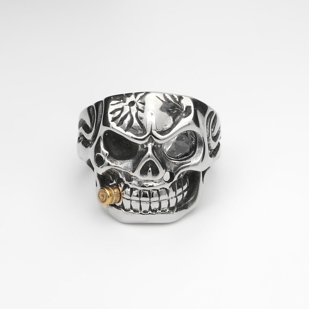 This stainless steel skull ring features a striking white CZ eye and a bold gold bullet design. Crafted with high-quality materials, it adds a touch of edgy sophistication to any outfit.